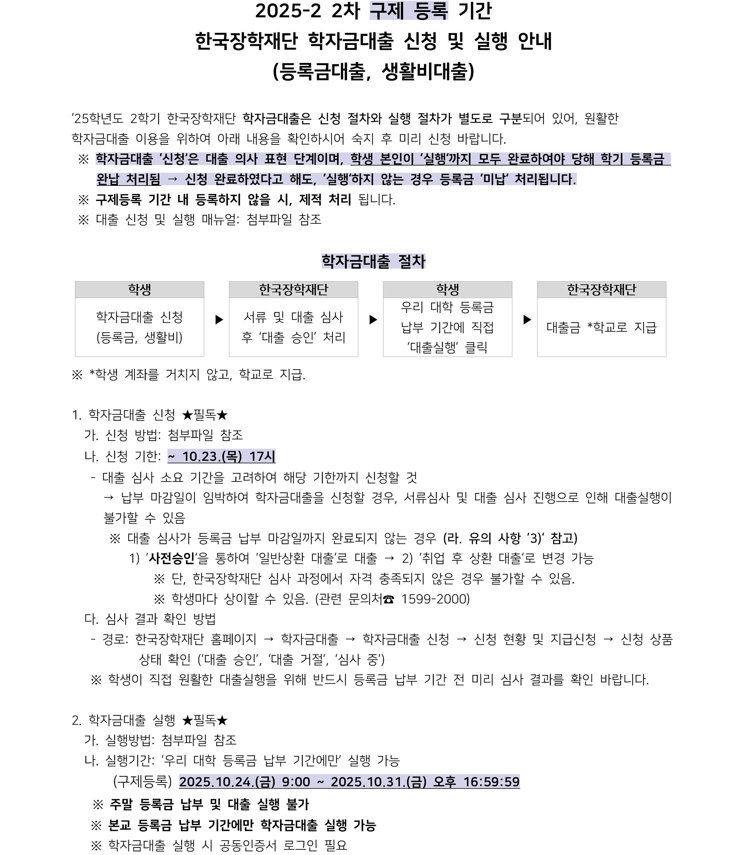 [장학] [학자금대출] 2차 구제 등록 기간(10.24. ~ 10.31.) 한국장학재단 학자금대출 신청 및 실행 안내 (등록금대출, 생활비대출)
