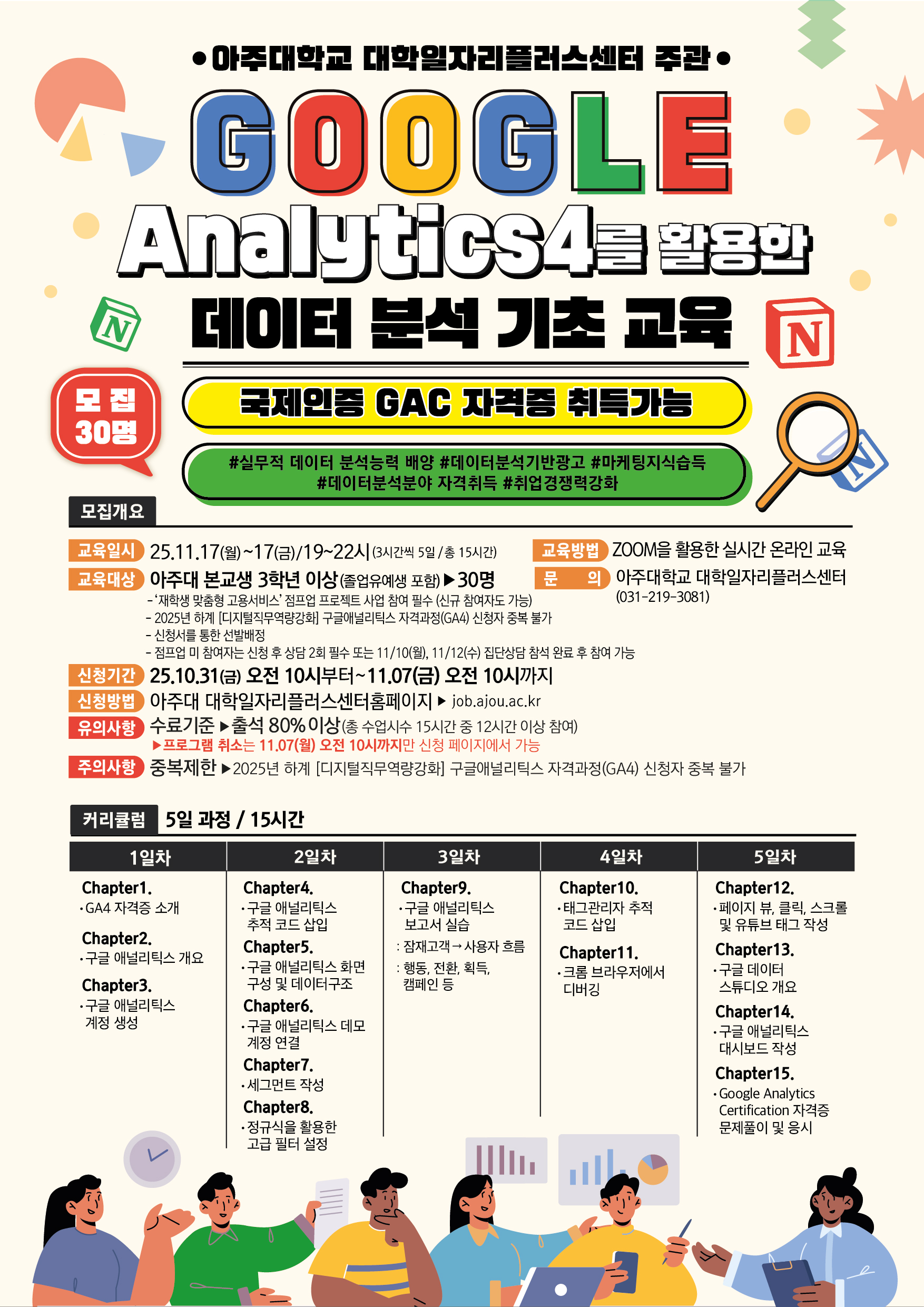 신 청 방 법 | 대상 | - 아주대 본교생 3학년 이상 (졸업유예생 포함) 30명 - ‘재학생 맞춤형 고용서비스’ 점프업 프로젝트 사업 참여 필수 (신규 참여자도 가능) - 2025년 하계 [디지털직무역량강화] 구글애널리틱스 자격과정(GA4) 신청자 중복 불가 - 신청서를 통한 선발 배정 - 재맞고 15H 오프라인 인정 |