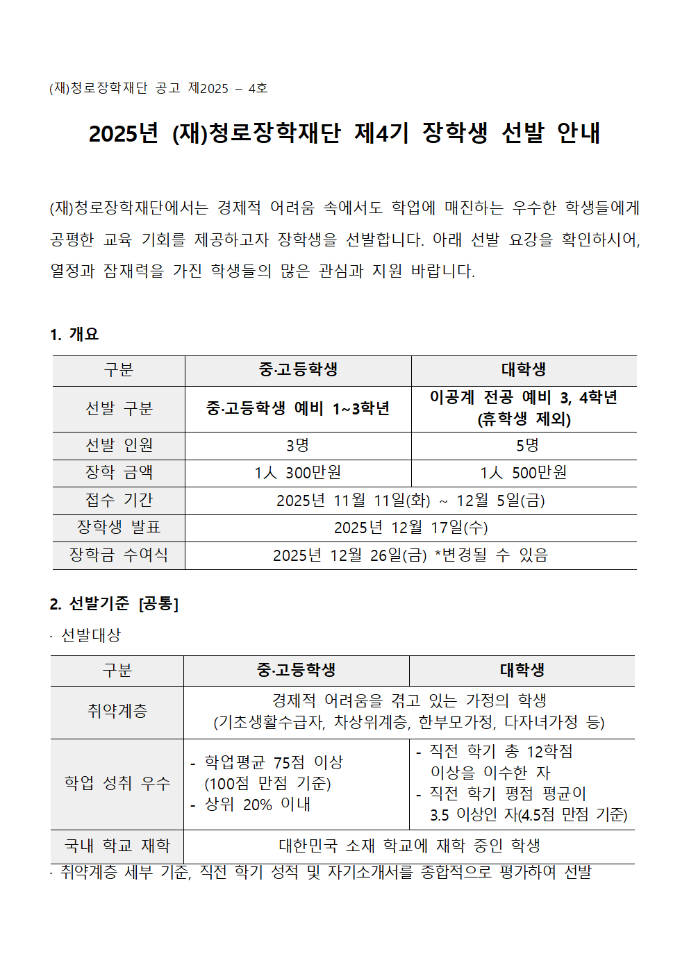 [장학] [교외장학] 2025년 (재)청로장학재단 제4기 장학생 선발