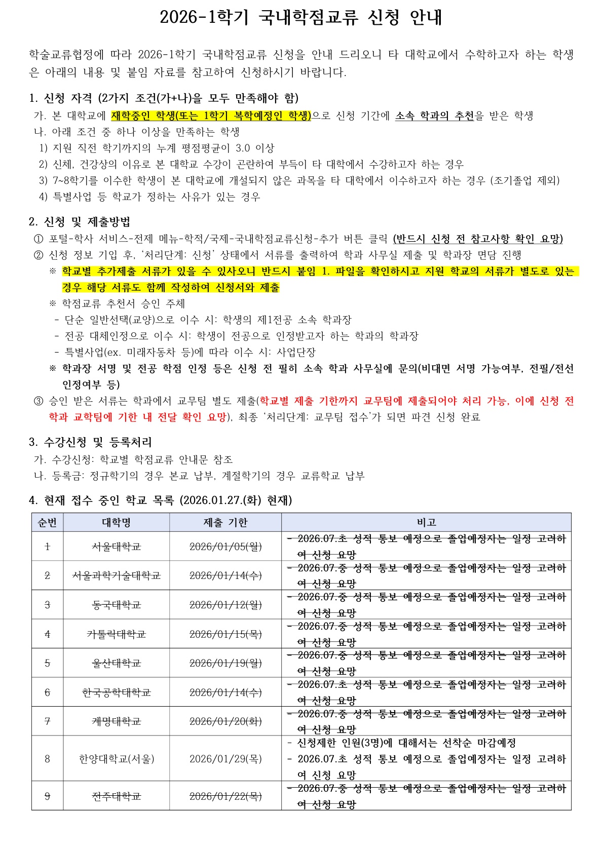 [학사] [학부/학사과정] (26.01.27.)(수정) 2026-1학기 국내대학 학점교류 신청 안내