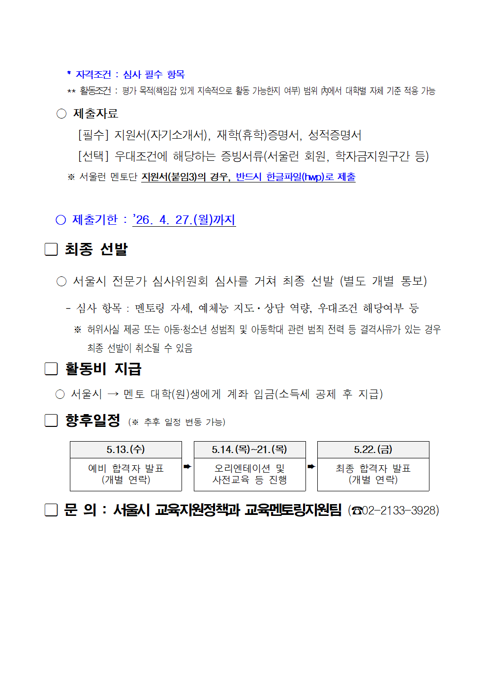 * 해당 멘토링 지원금은 장학이 아니며, 제세공과금을 제외하고 지급됨을 안내드립니다.