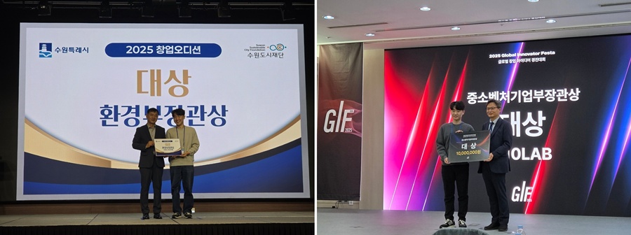 엑스텐랩 대표인 류관형 학생이 수원시가 주최한 '2025 창업오디션'(사진 좌측)과 '2025 글로벌 창업 아이디어 경진대회'에서 장관상을 수상하고 있다